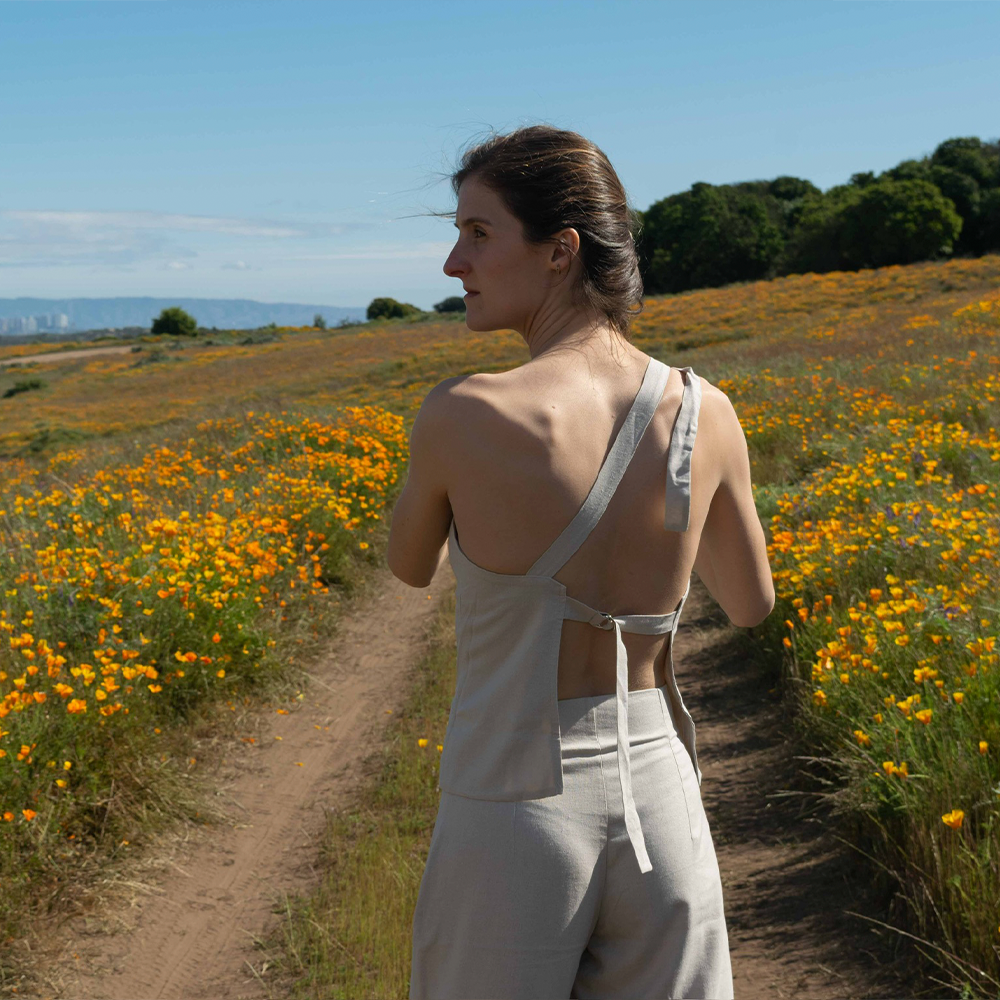 Blusa de lino color beige/arena. Una manga con lazo ajustable en el hombro y espalda abierta. Calce sastrero con pinzas para dar forma.