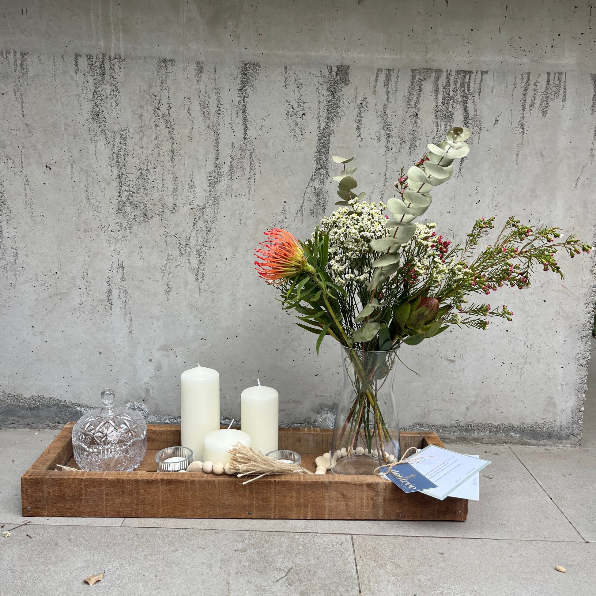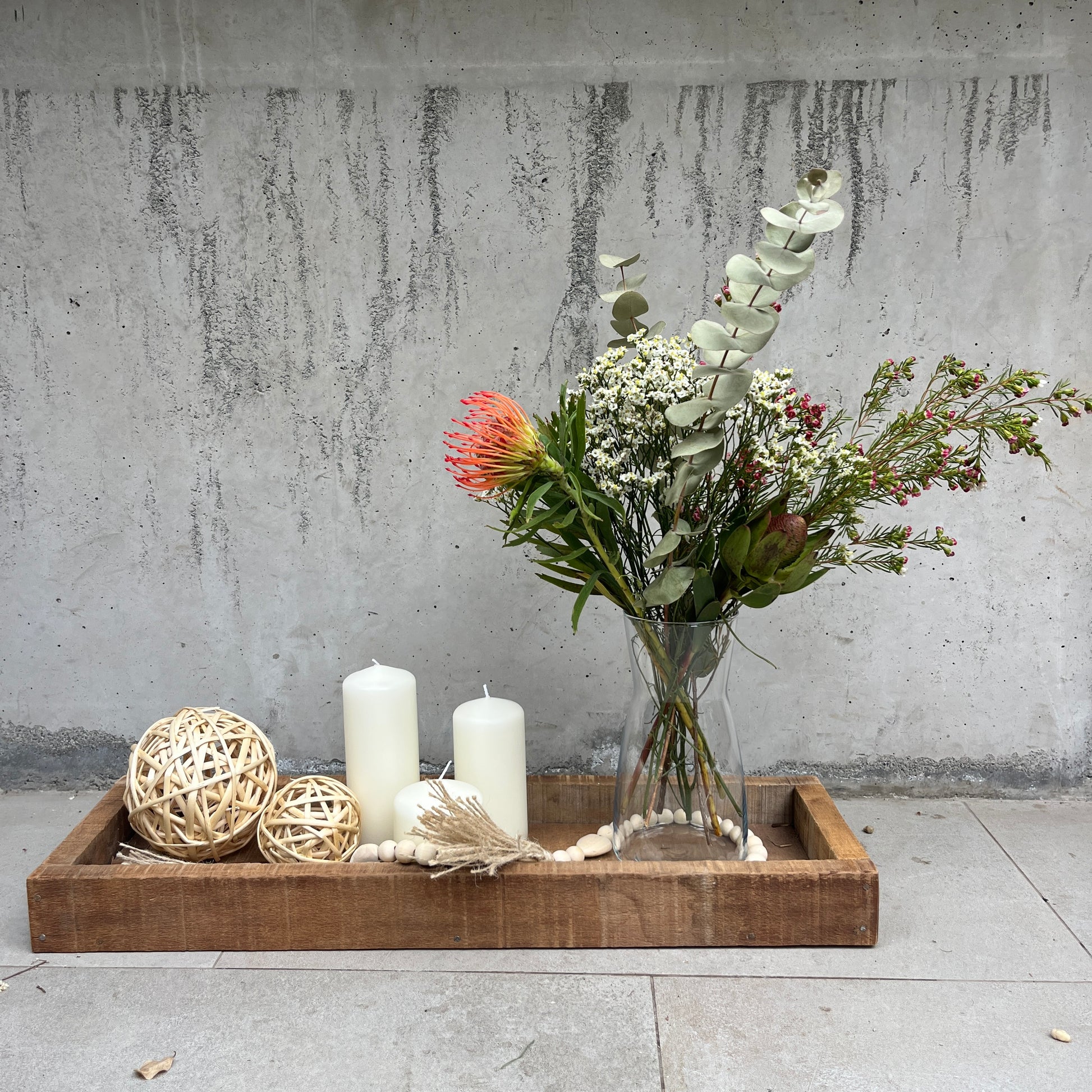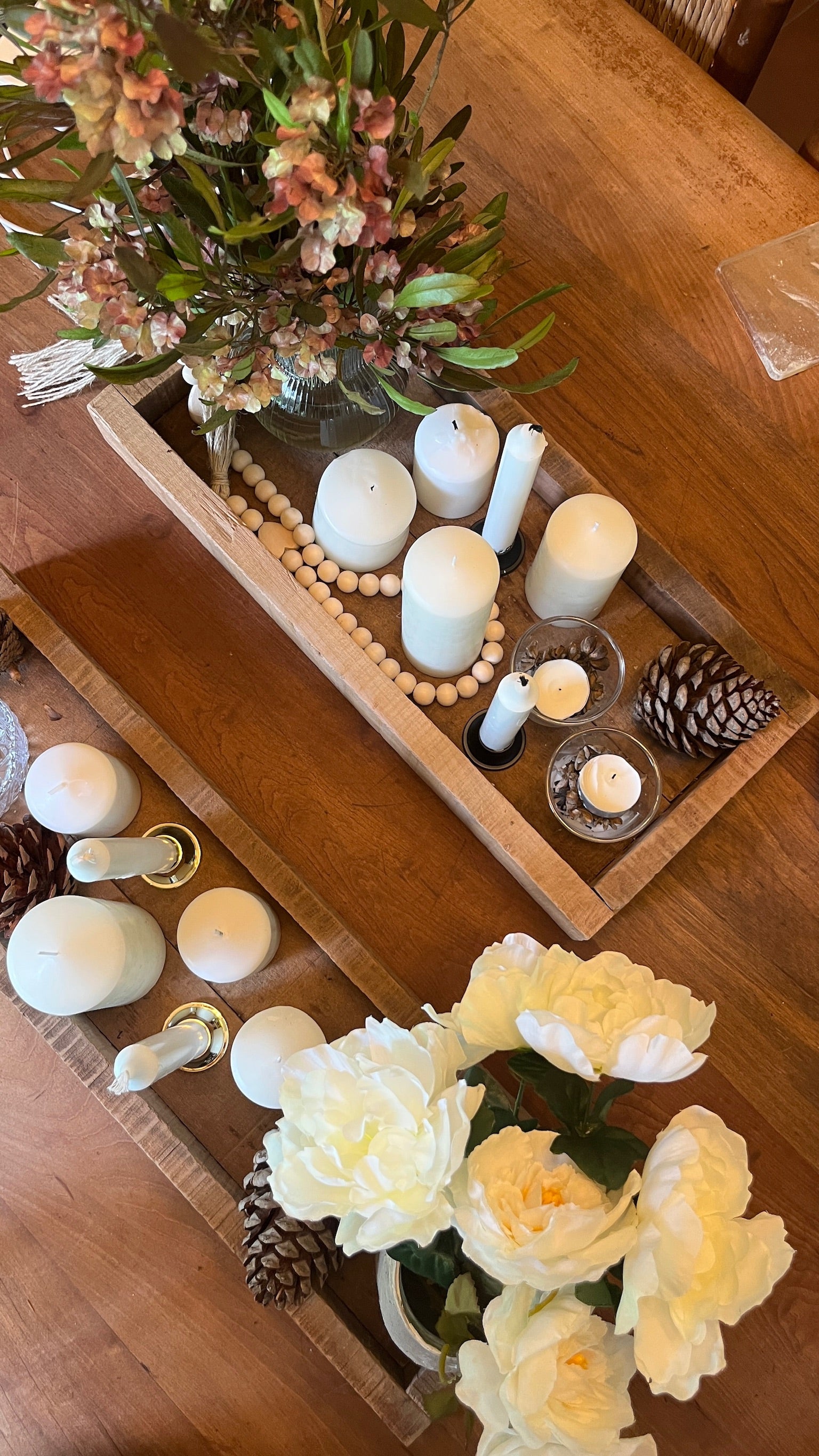 Centro de mesa llegar y ubicar en tu casa, incluye la bandeja de madera rústica, 4 velones, 2 velas largas con su soporte, 2 velas en frascos de vidrio, collar de borlas decorativo y florero con flores secas.