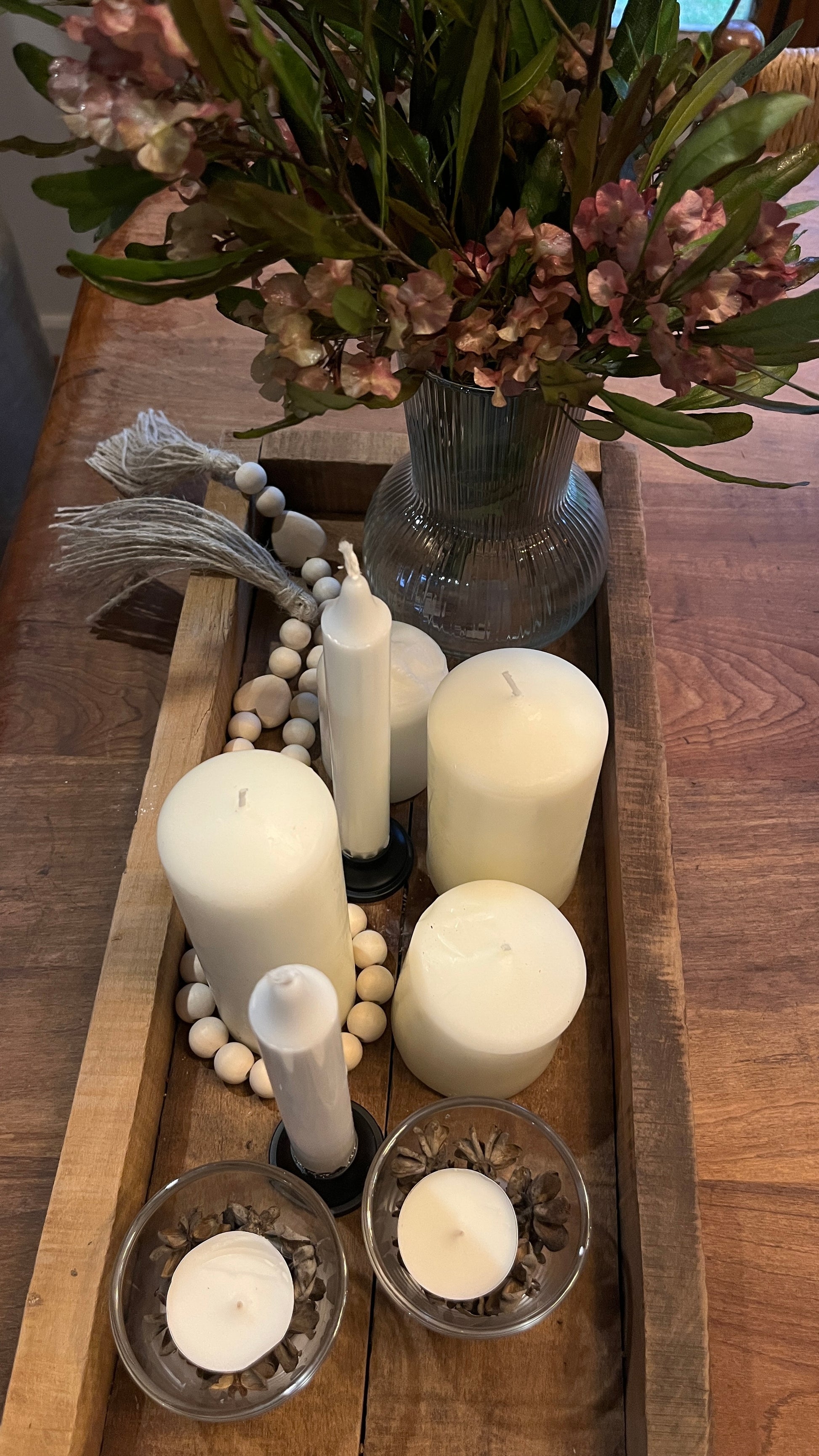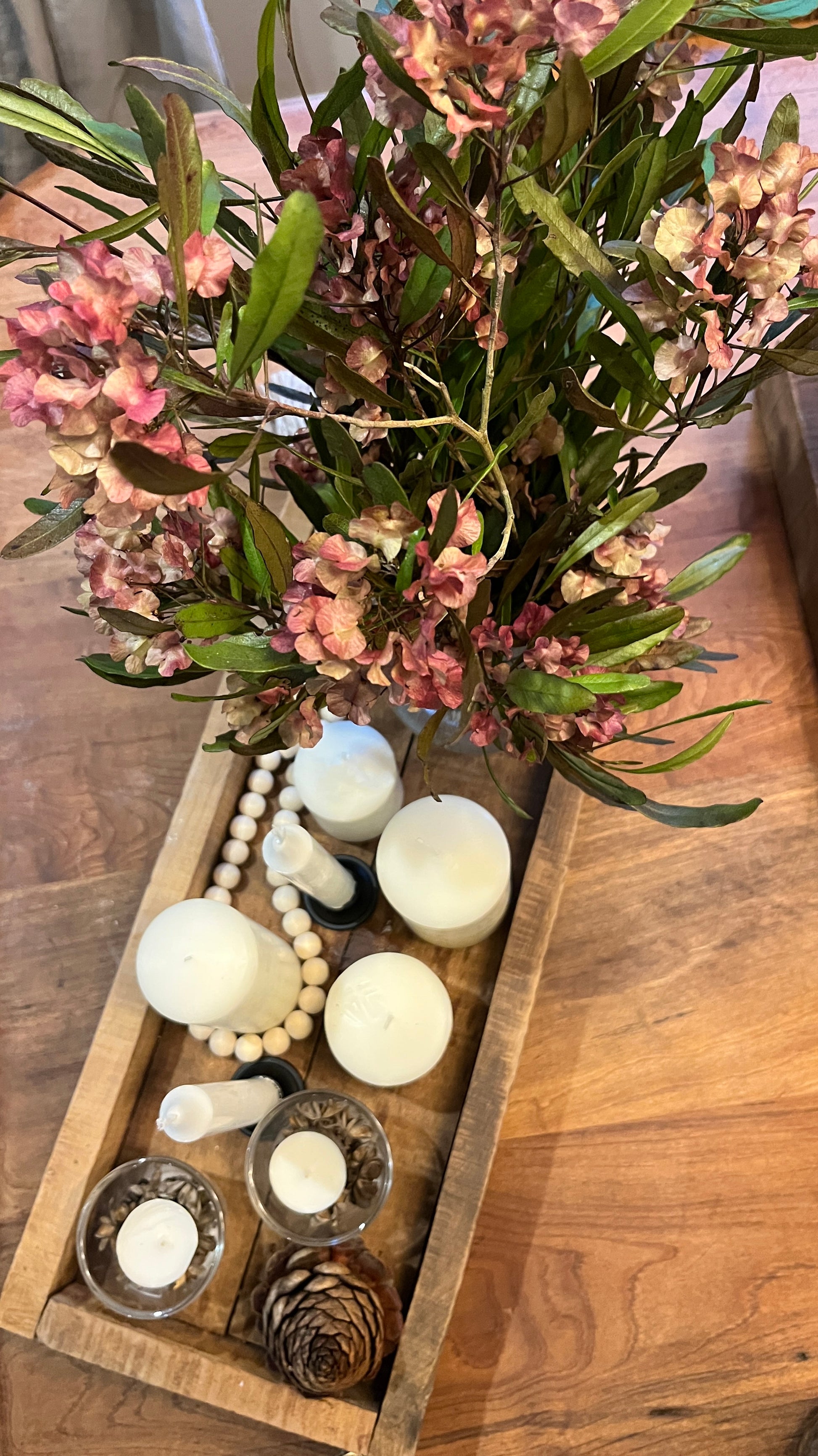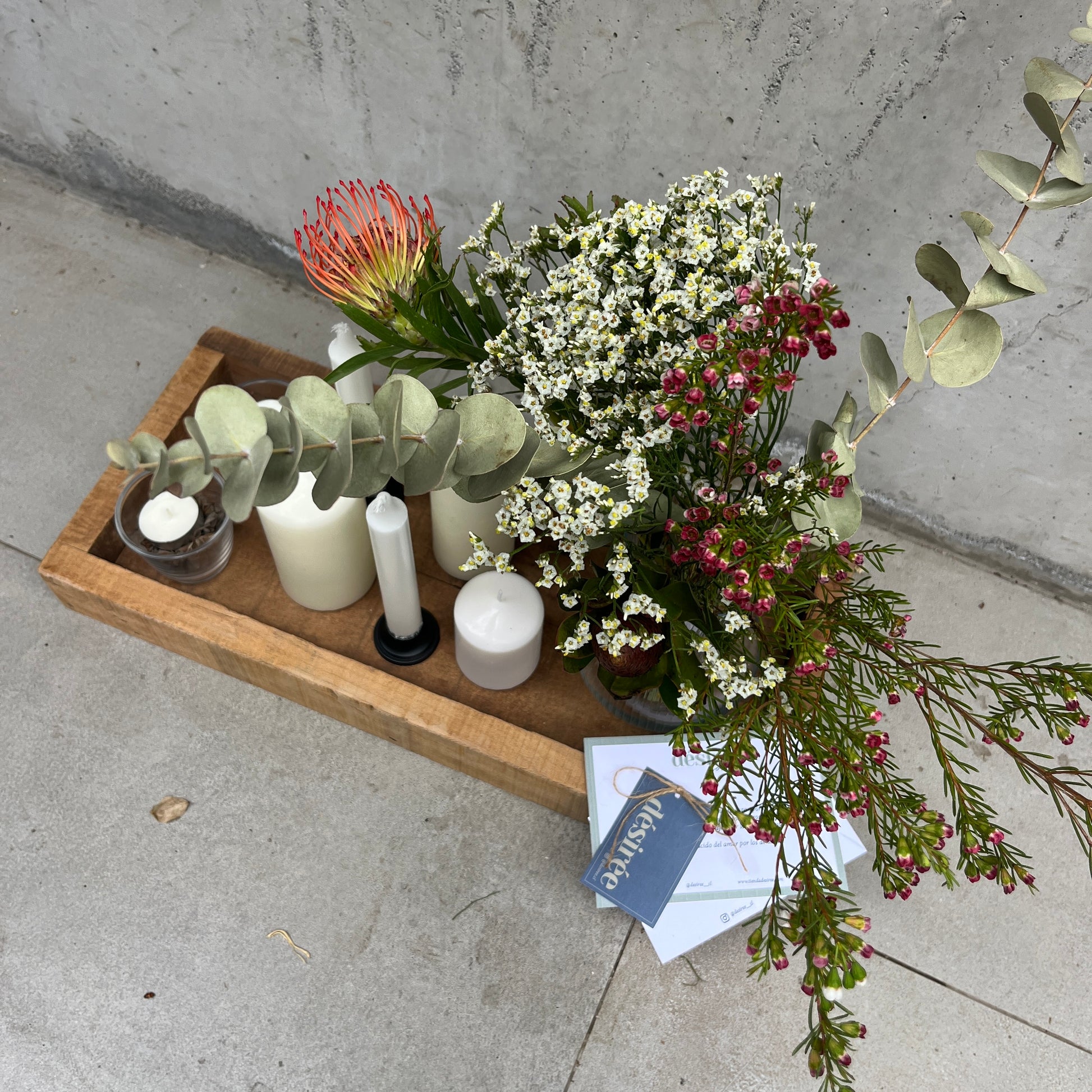 Centro de mesa llegar y ubicar en tu casa, incluye la bandeja de madera rústica, 4 velones, 2 velas largas con su soporte, 2 velas en frascos de vidrio, collar de borlas decorativo y florero con flores secas.