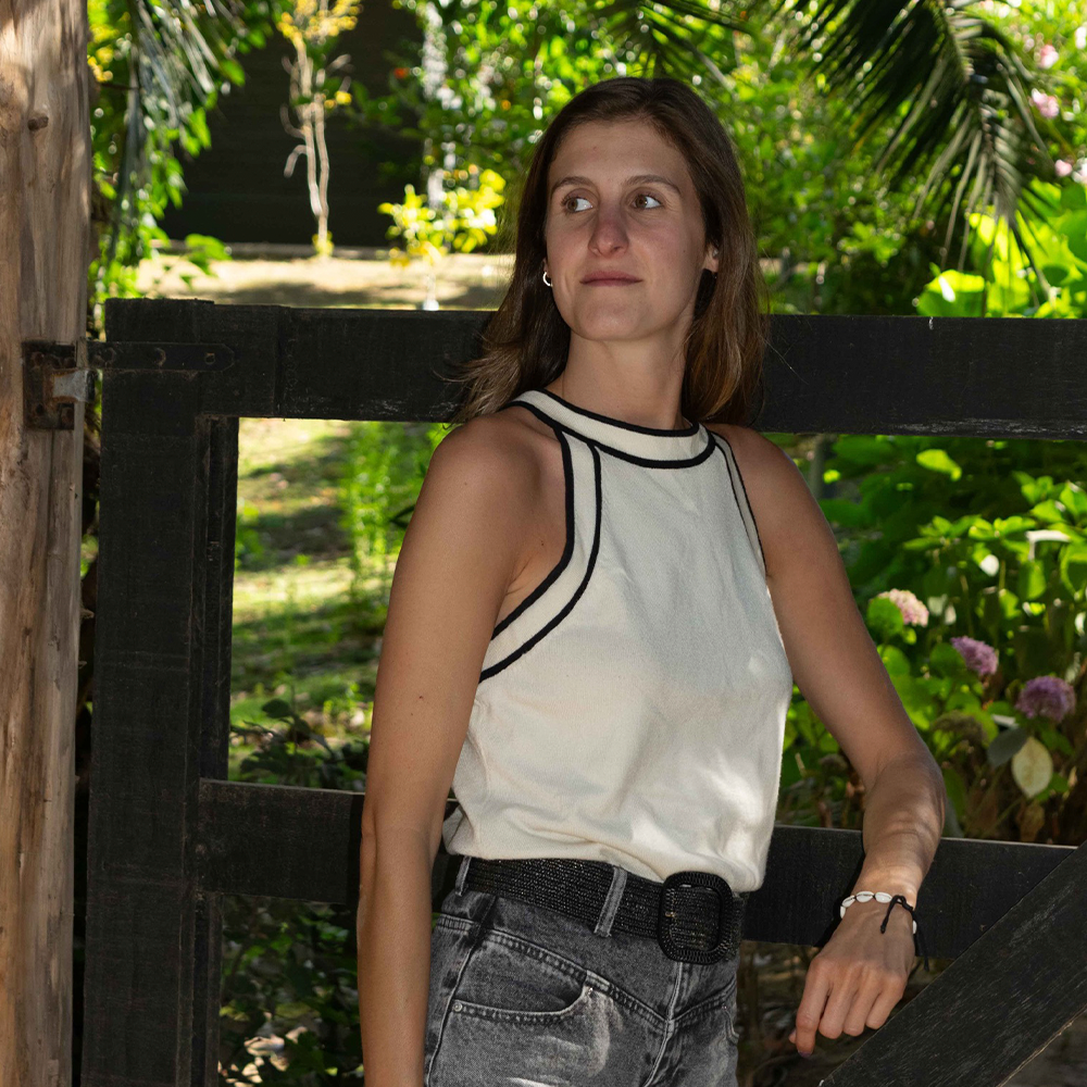 Polera halter de algodón tejido color crudo con detalles negros.