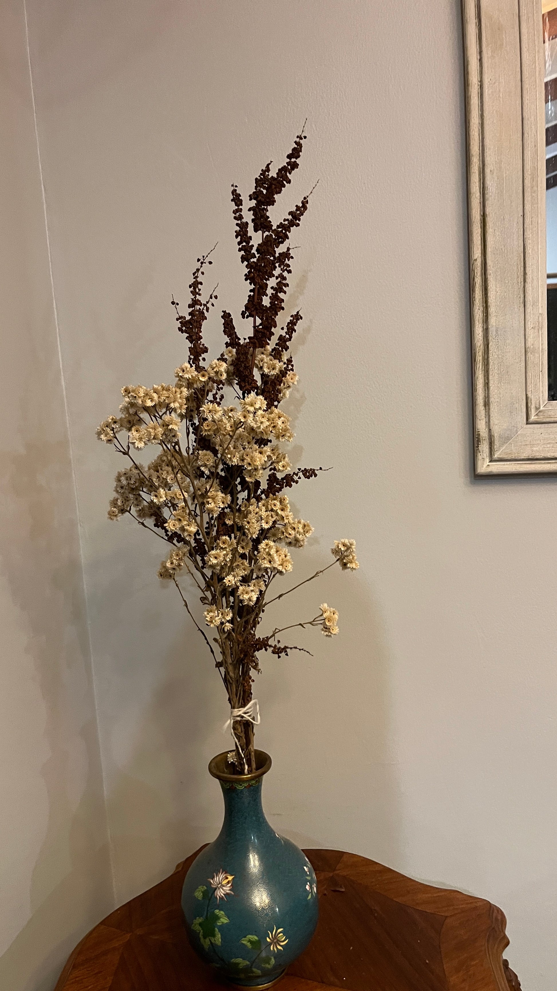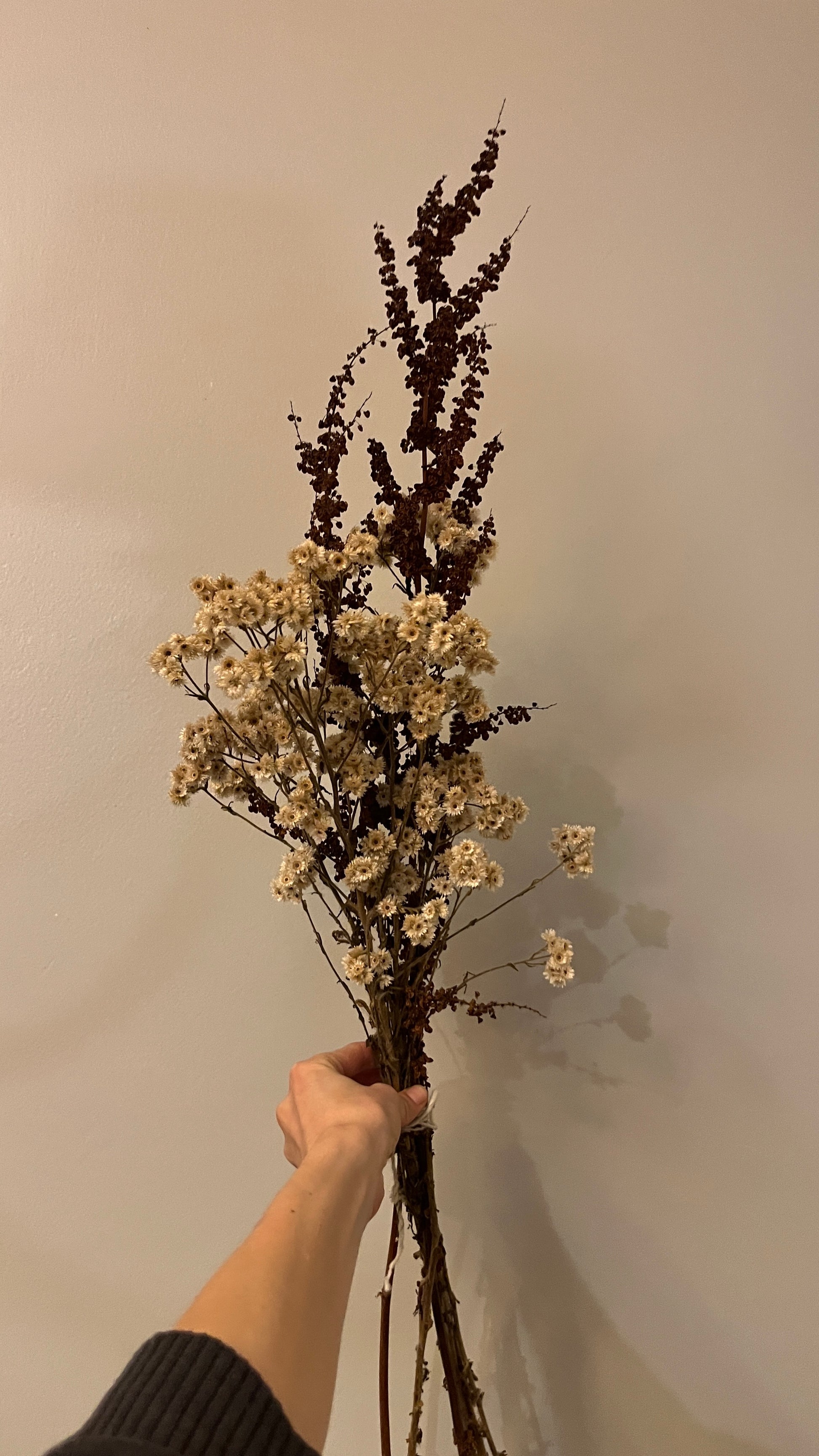 Ramo de flores secas, mezcla de siempre vivas y tallos café.